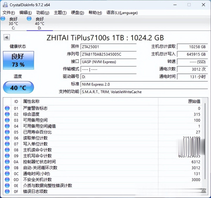 写入经由中的特别断电测试共实行3000次轮回,测试遣散后主机写入量645TB,剩余健康度73%: