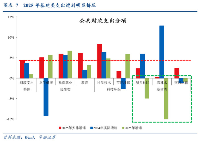 根据财政部最新数据,在2025年全国一般公共预算支出主要支出科目中,与基建密切相关的农林水支出、城乡社区支出、交通运输支出分别同比下降13.2%、5%和0.7%。这三项基建类支出合计规模较2024年下降约7.8%,明显低于2025年全国一般公共预算支出平均增速(1%)。