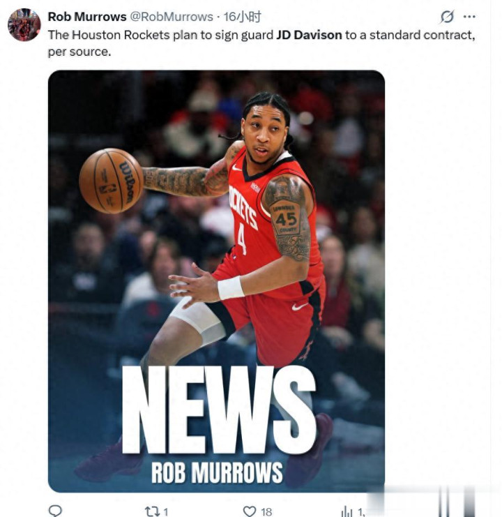 据多位 NBA 记者报说念,火箭瞻望将在季后赛运行前,把球队双向合同球员 JD・戴维森的合同转为 NBA 挨次负责合同,以补充球队的后场握球深度。当今火箭领有空余的 15 东说念主挨次合同限额,这一滑换将让戴维森有时出战剩余惯例赛及季后赛。