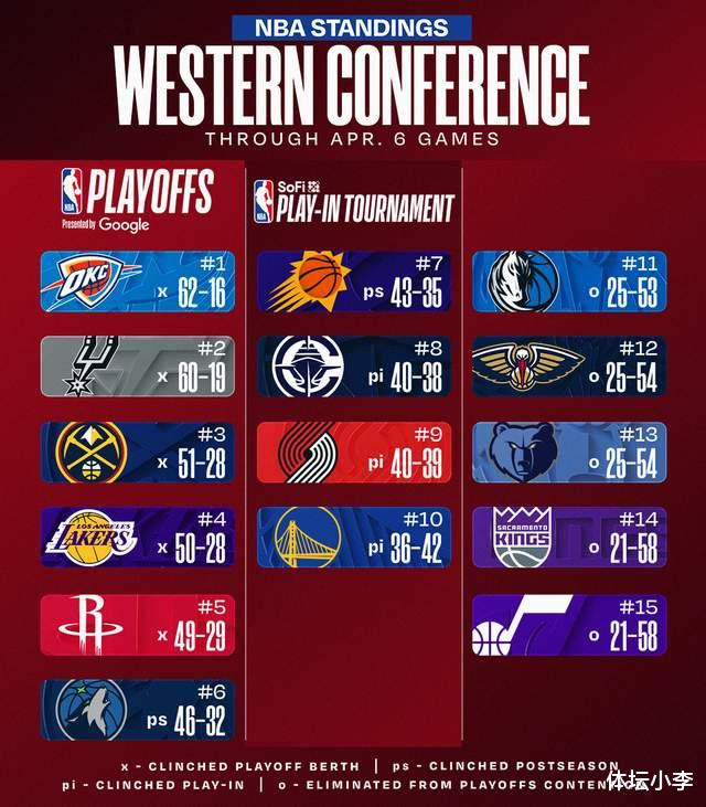 北京技巧4月7日,NBA惯例赛参加尾声,现在东西部前十球队齐也曾笃定,不外具体的排行则唯有活塞笃定东部第一,其他19支球队齐莫得笃定,依然存在变数。而在这当中,西部排行是最引东说念主关心的,掘金逆转开采者豪取9连胜后高出湖东说念主来到第三,火箭则坐收谋利有契机在首轮对上缺兵少将的湖东说念主,快船这边第八的位置也有点稳了。