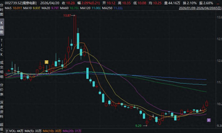 4月20日开盘,儒意电影股价高涨,舍弃发稿,股价涨幅为2.09%,报10.28元/股,总市值为217亿元。