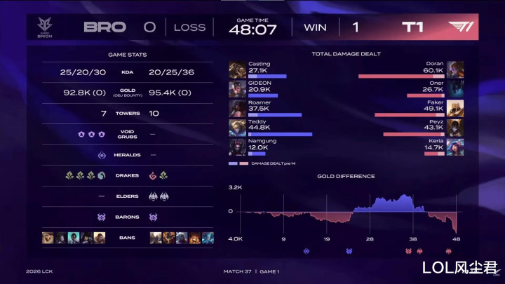 LCK其他强队打BRO,大多皆是30分钟内戒指接触,T1能两把熬到40分钟以上,亦然真有点离谱了,天然比赛赢了,但T1边线照旧老形式,Peyz这场BO3,嗅觉在跟Teddy,竞争T1队史最菜AD,一个女警,果然走到对面脸上去输出,多兰的话略微好少许,前期一般,后期团战有领略。