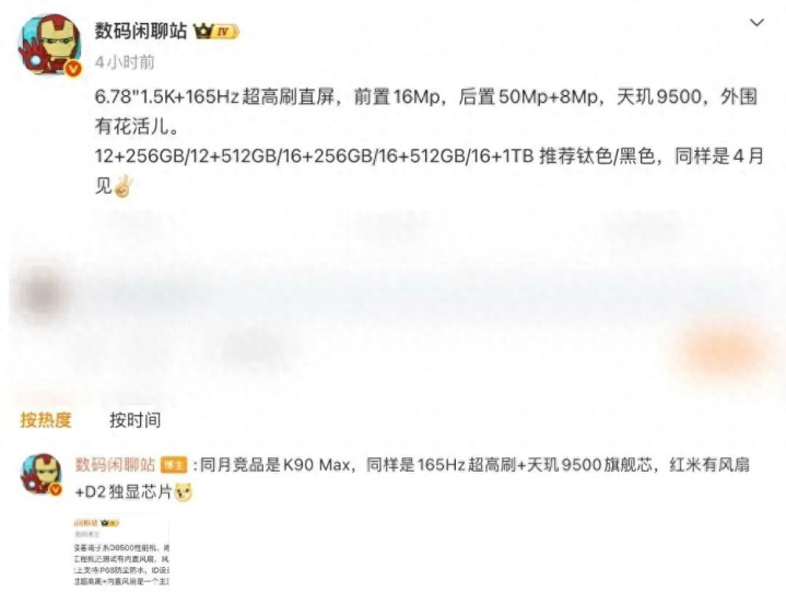 数码闲扯站的爆料截图 · 博主爆料新机成立及竞品REDMI K90 Max信息