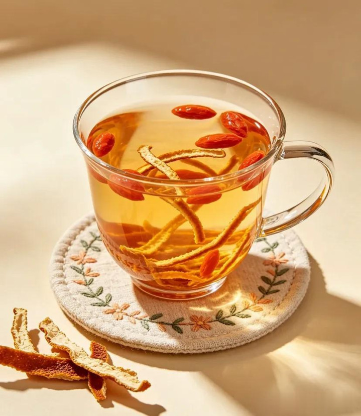 陈皮疏肝理气、健脾和胃,化解肝气郁结,枸杞养肝柔肝,两者搭配,理顺肝气、养护脾胃,肝脾同养,体格更陶然。