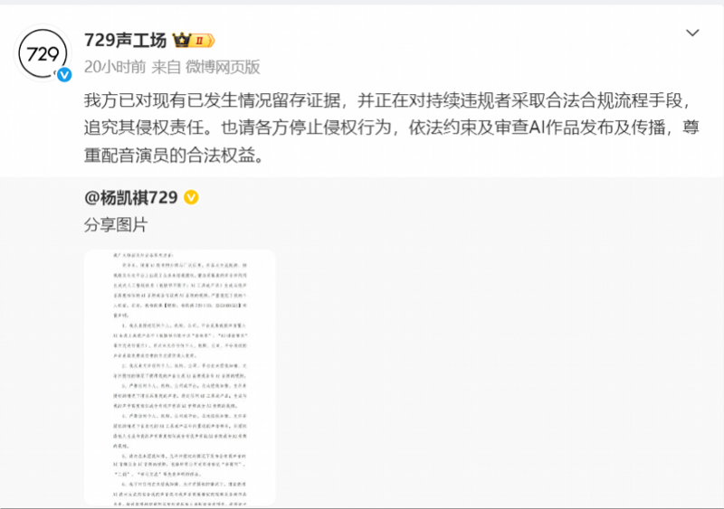 对此,729声工厂官方账号同步转发声明并暗意,已对现存已发生情况留存笔据,并正在对握续违法者遴荐正当合规历程技巧,细致其侵权背负。也请各方罢手侵权活动,照章敛迹及审查AI作品的发布及传播,尊重配音演员的正当职权。